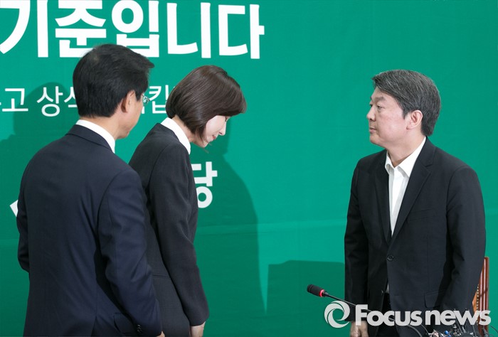 (서울=포커스뉴스) 2일 오전 서울 여의도 국회에서 열린 국민의당 최고위원회의에 국민대표 직함으로 참석한 故 가수 신해철의 아내 윤원희(가운데) 씨가 '의료사고 피해구제 및 의료분쟁 조정 등에 관한 법률 일부개정법률안(일명 신해철법)' 처리를 호소한 뒤 퇴장하며 안철수(오른쪽) 상임공동대표와 인사하고 있다. 왼쪽은 천정배 공동대표.