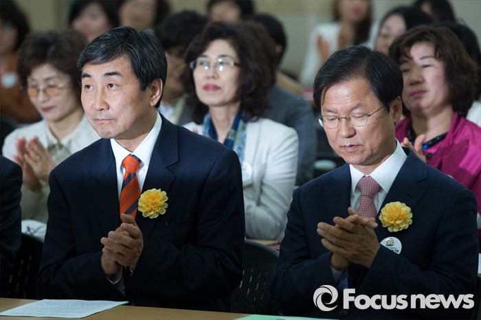 (서울=포커스뉴스) 27일 오후 서울 영등포구 이룸센터에서 열린 한국가정어린이집연합회 정기총회에 이종걸(왼쪽)더불어민주당 원내대표와 천정배 국민의당 공동대표가 참석해 박수를 치고 있다.