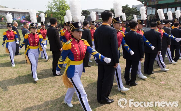 (서울=포커스뉴스) 29일 오후 서울 노원구 육군사관학교에서 열린 개교 70주년 기념식에서 생도들이 아름다운 육사인 70인에 선정된 선배들에게 메달 전달 후 퇴장하고 있다.