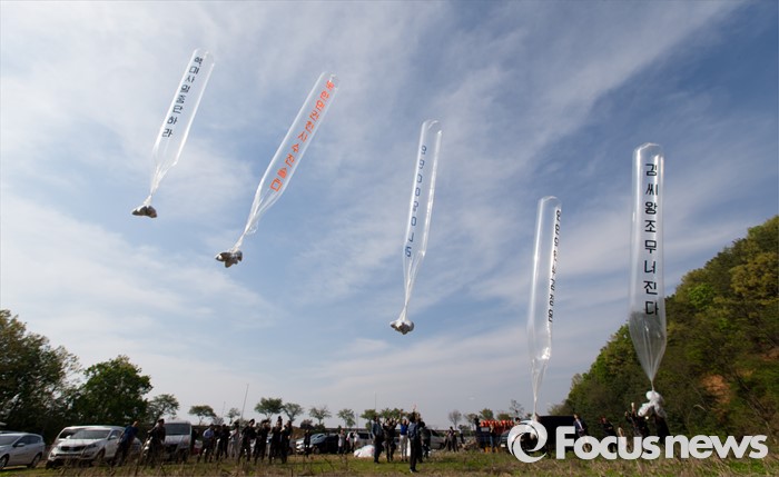 (파주=포커스뉴스) 29일 오후 경기 파주 낙하IC 인근에서 탈북자단체인 자유북한운동연합이 북한에 핵과 미사일을 포기하고 국제사회 일원으로 참여할 것을 촉구하는 내용의 대북전단을 날려보내고 있다.