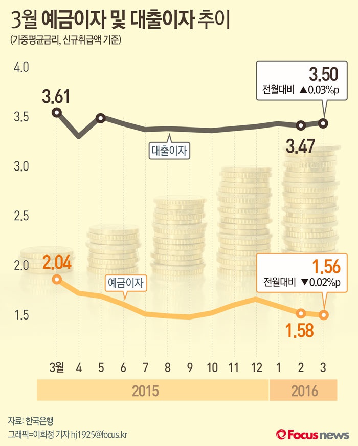 (서울=포커스뉴스) 28일 한국은행이 발표한 '2016년 3월중 금융기관 가중평균금리' 자료에 따르면 3월 대출금리는 3.50%로 전월대비 0.03%포인트 올랐다. 예금은행의 신규취급액기준 저축성수신금리는 1.56%로 전월대비 0.02%포인트 떨어졌다.