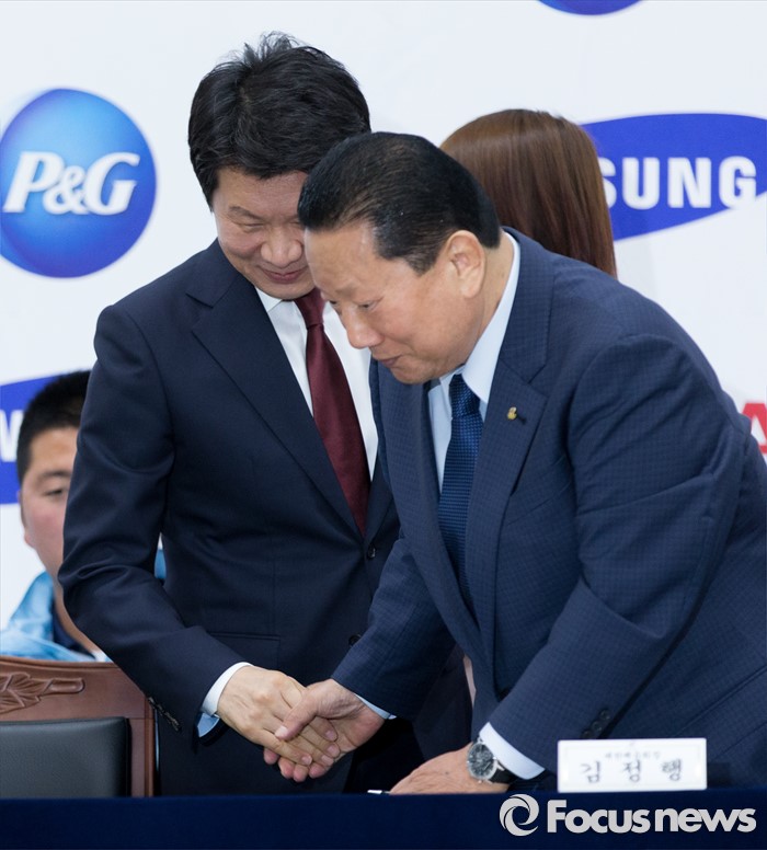 (서울=포커스뉴스) 27일 오후 서울 노원구 태릉선수촌에서 제31회 리우하계올림픽대회 D-100일 미디어데이에 참석한 김정행(오른쪽) 대한체육회장과 정몽규 선수단장이 악수를 하고 있다.