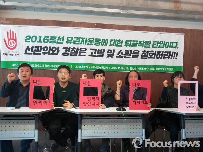 (서울=포커스뉴스) 2016총선시민네트워크(총선넷)가 소속 회원들을 공직선거법 위반 혐의로 검찰에 고발한 서울시선거관리위원회를 규탄했다.