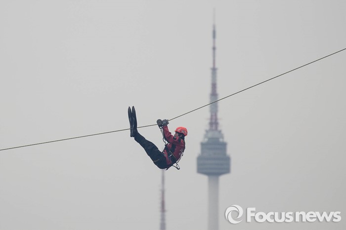 (서울=포커스뉴스) 27일 오전 서울 영등포구 여의도 한강공원 원효대교 일대에서 열린 '수도 서울 민․관․군 합동 대규모 복합재난 가상훈련'에 참가한 구조대원들이 레펠하강을 하고 있다.