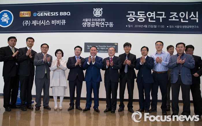(서울=포커스뉴스) 25일 오전 서울 관악구 서울대학교 수의과대학 생명공학 연구동에서 열린 서울대-BBQ 공동연구 조인식에서 윤홍근(왼쪽 여섯번째) 제너시스비비큐 그룹 회장과 박용호 서울대 수의과대학 교수가 현판식을 끝내고 박수를 치고 있다.