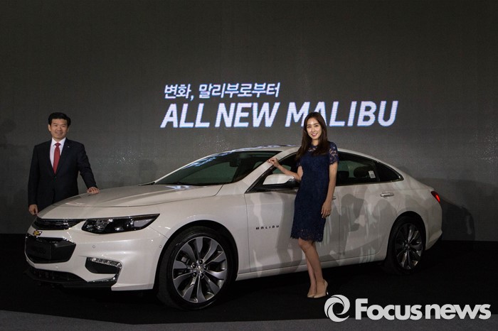 (서울=포커스뉴스) 27일 오전 서울 구로구 고척스카이돔에서 열린 한국지엠 '올 뉴 말리부' 신차 발표회에서 최희 아나운서와 제임스 김 한국지엠 사장이 신차 발표를 축하하며 취재진을 향해 포즈를 취하고 있다.