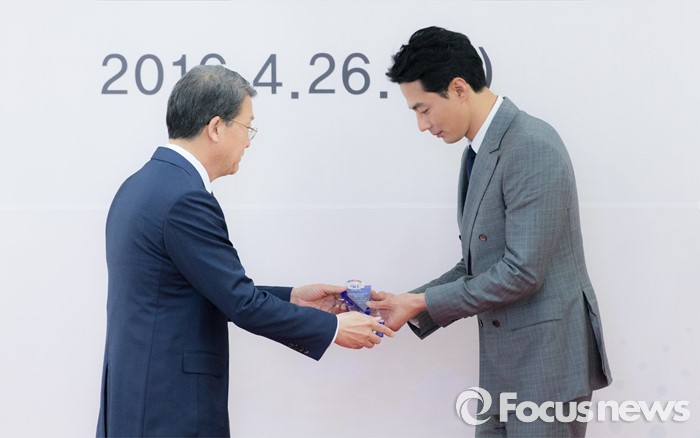 (서울=포커스뉴스) 26일 오후 서울 종로구 서울지방국세청에서 2016 국세청 홍보대사로 위촉된 배우 조인성(오른쪽)이 임환수 국세청장으로부터 위촉패를 전달 받고 있다.