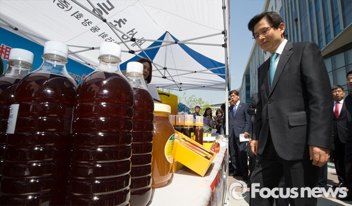 (세종=포커스뉴스) 황교안 국무총리가 26일 오전 세종시 정부세종청사 국토교통부 내 광장에서 열린 국무총리실과 1사 1촌 자매결연을 맺은 충주 재오개마을 농·특산물 직거래 장터에 방문해 농산물과 특산물을 살피고 있다.