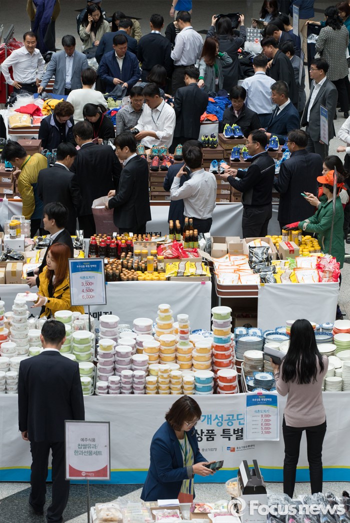 (대전=포커스뉴스) 28일 오전 정부대전청사 중앙홀에 마련된 개성공단 우수상품 특별판매전에서 공무원들이 제품을 살피고 있다. 개성공단 우수상품 특별판매전은 개성공단 입주기업 피해를 최소화 하기 위해 중소기업청이 주최했다.