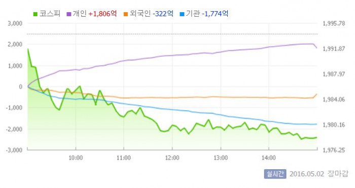 이날 코스피는 전거래일 대비 0.12% 하락한 1991.84로 장을 시작했다. 이후 지수는 외국인과 기관의 매도 공세에 하락세를 지속했다.