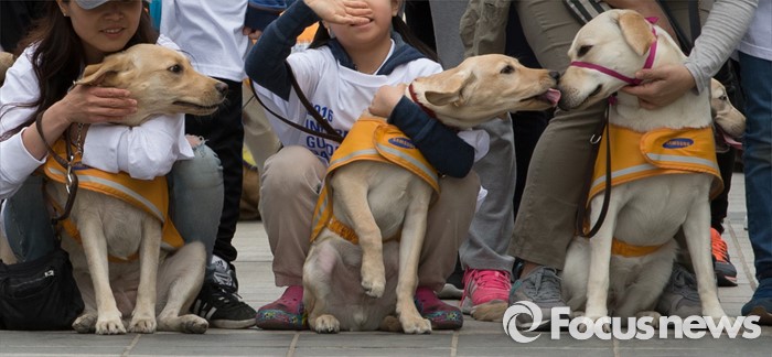 (서울=포커스뉴스) 27일 오전 서울 청계천에서 삼성화재안내견학교 훈련사들과 안내견들이 시민들과 함께 '안내견과의 만남' 행사를 하고 있다.