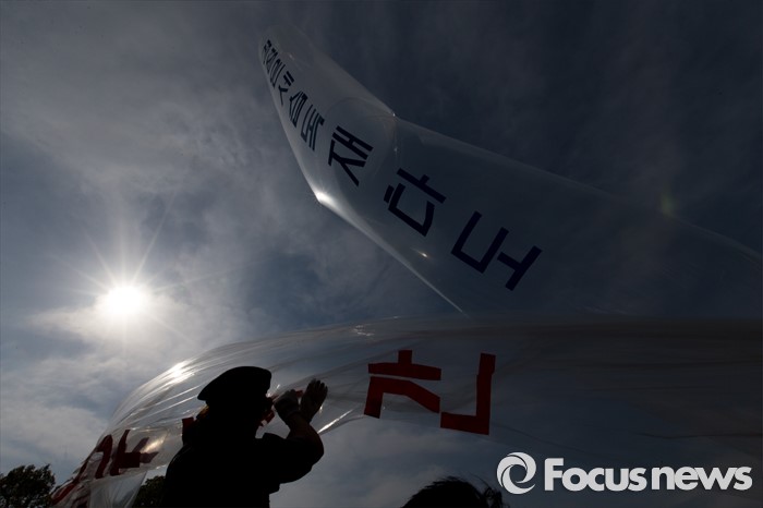 (파주=포커스뉴스) 29일 오후 경기 파주 낙하IC 인근에서 탈북자단체인 자유북한운동연합이 북한에 핵과 미사일을 포기하고 국제사회 일원으로 참여할 것을 촉구하는 내용의 대북전단을 날려보내고 있다.