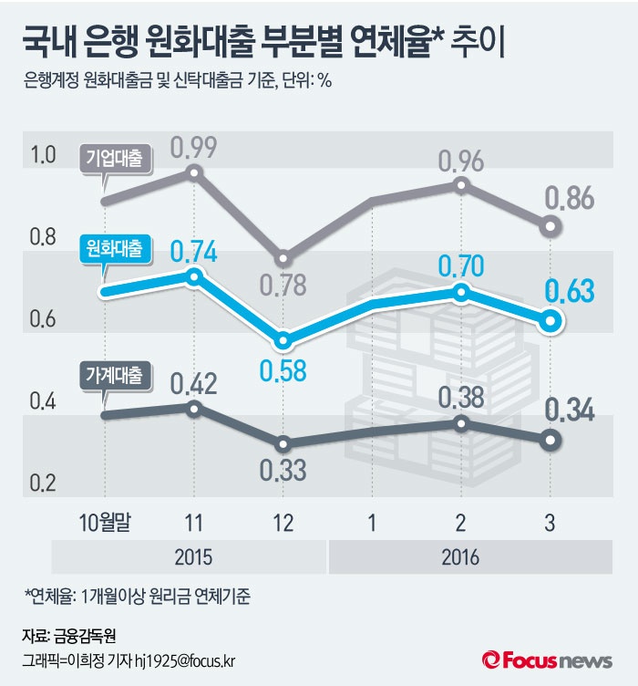 (서울=포커스뉴스) 2일 금융감독원이 발표한 '2016년 3월말 국내은행의 대출채권 및 연체율 현황'에 따르면 국내 은행 원화 대출 연체율은 2월말 대비 0.07%포인트 내려간 0.63%다.