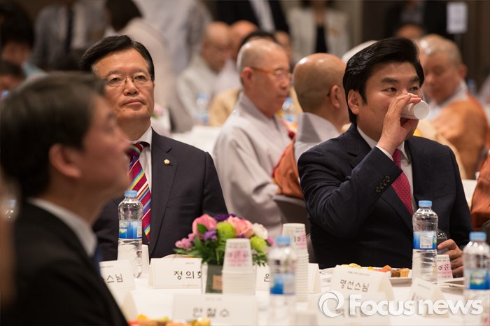 (서울=포커스뉴스) 2일 오후 서울 중구 프레스센터에서 열린 BBS 불교방송 개국 26주년 기념 비전선포식에 참석한 원유철(오른쪽) 새누리당 원내대표가 물을 마시고 있다.