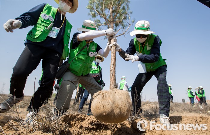 (다라더치/중국=포커스뉴스) 25일 오전 중국 내몽고 다라더치 쿠부치사막에서 2016 미래숲 15기 녹색봉사단원들이 나무 심기 작업을 하고 있다. 미래숲 녹색봉사단은 이번 봉사활동을 통해 황폐화된 사막에 나무 심기 및 각국 청년들과 우호를 증진을 위한 교류 활동을 전개했다.