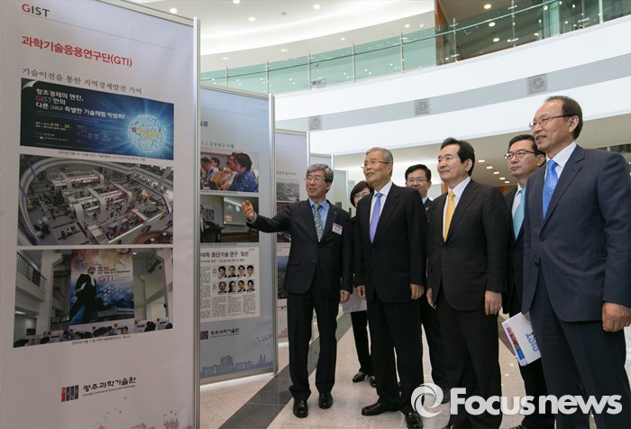(광주=포커스뉴스) 김종인(왼쪽 두번째) 더불어민주당 비대위 대표 등 의원들이 25일 오후 광주과학기술원(GIST, 지스트)을 방문해 문승현(왼쪽 첫번째) 총장으로부터 설명을 듣고 있다.