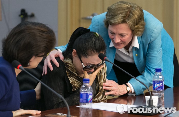 (서울=포커스뉴스) 26일 오후 서울 여의도 국회 의원회관에서 북한자유주간 주최, 통일맘연합 주관으로 열린 중국과 제3국에서 자녀와 헤어진 탈북여성들의 호소, '내 아이를 안고 싶어요' 증언대회에 참석한 수잔 숄티(오른쪽) 북한자유연합 대표가 발언 중 눈물을 흘리는 탈북여성을 위로하고 있다.