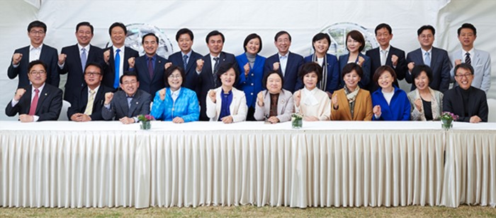 (서울=포커스뉴스) 더불어민주당 20대 총선 서울지역 당선자들과 박원순 서울시장이 지난 24일 오후 종로구 가회동 시장공관에서 정책협의 간담회를 가진 뒤 기념촬영을 하고 있다. 더불어민주당 서울시당은 이날 간담회에서 서울을 '경제민주화 특별시'로 만들고, 무능하고 독선적인 정부의 퇴행적인 기동을 저지하는 결의문을 채택했다고 전했다. <사진제공=더민주 서울시당>