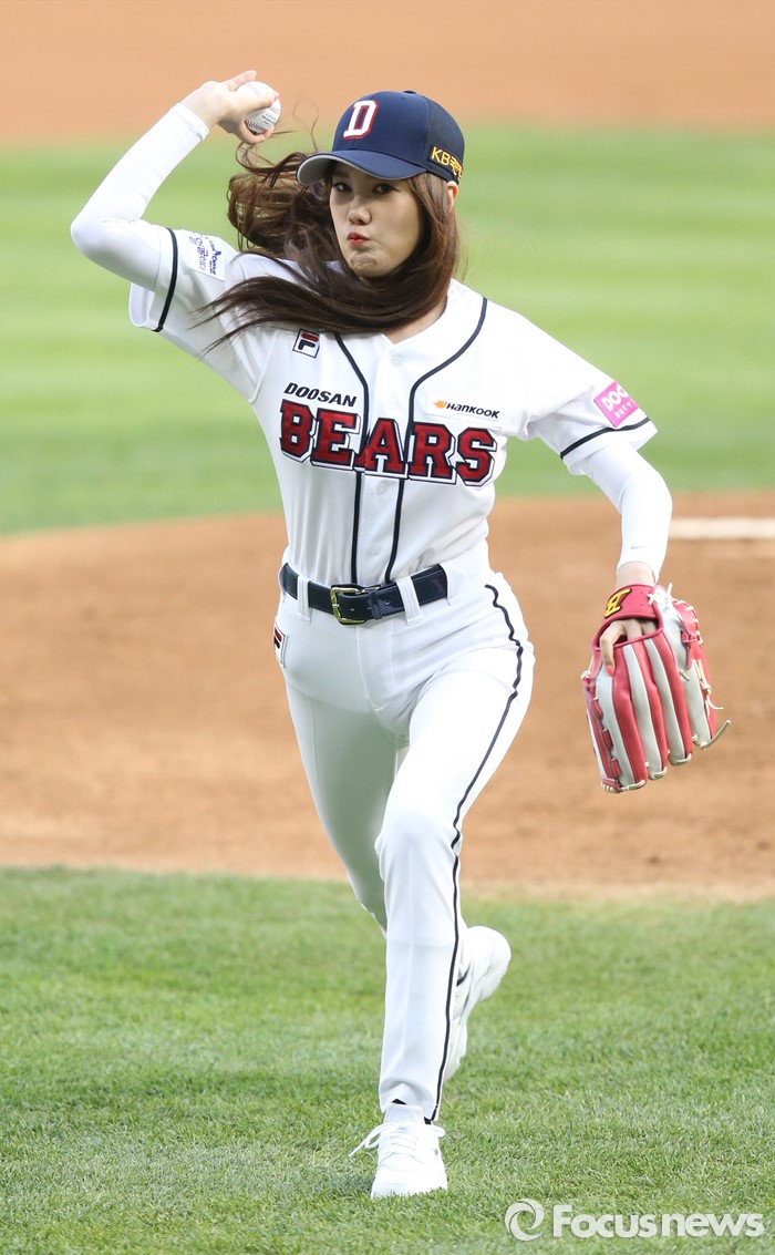 (서울=포커스뉴스) 28일 서울 잠실구장에서 열린 2016 프로야구 SK-두산 경기에 앞서 가수 김현정이 시구하고 있다.