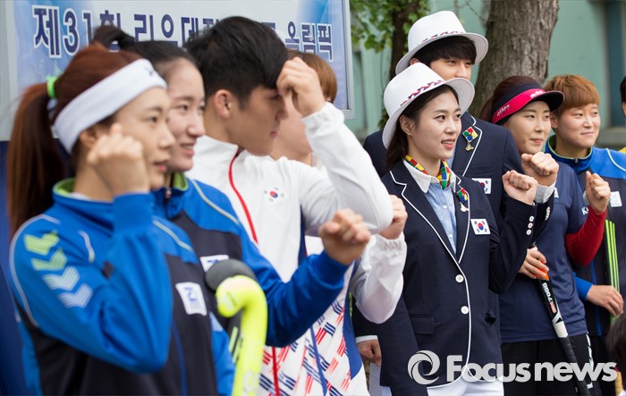 (서울=포커스뉴스) 27일 오후 서울 노원구 태릉선수촌에서 열린 제31회 리우하계올림픽대회 D-100일 미디어데이에서 국가대표 선수들이 파이팅을 외치며 기념촬영을 하고 있다.
