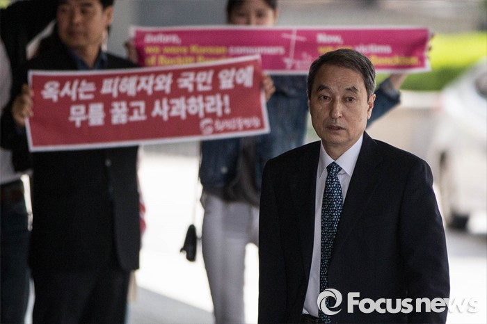 (서울=포커스뉴스) 가습기 살균제 과실 책임을 받고 있는 신현우 전 옥시 대표가 피의자 신분으로 26일 오전 서울 서초구 서울중앙지방검찰청에 출두하고 있다.