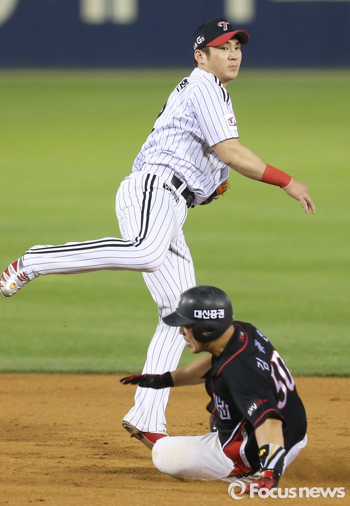 (서울=포커스뉴스) 29일 서울 잠실구장에서 열린 2016 프로야구 kt-LG 경기 9회초 1사 1,2루에서 kt 박기혁의 2루땅볼때 1루주자 김종민이 2루에서 포스아웃되고 있다. LG 유격수 오지환이 1루로 송구해 더블플레이 성공.