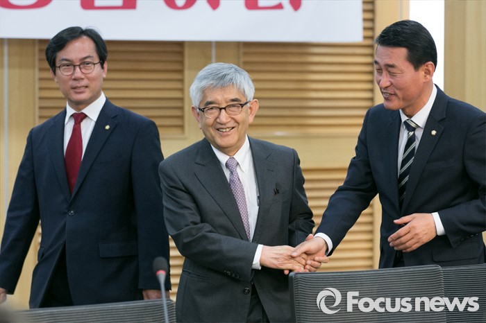 '김황식 전 총리 등이 유력하게 거론되는지' 기자들의 질문이 이어지자 "거론되는 분들은 있는데 일치된 평가가 나오지는 않고 있다"면서 말을 아꼈다.최장집(가운데) 고려대 명예교수가 25일 오후 서울 여의도 국회 의원회관에서 새누리당 혁신모임 외부인사 간담회에 초청되어 강연 전, 황영철(오른쪽), 김영우(왼쪽) 의원과 악수하고 있다. 2016.04.25 박철중 기자