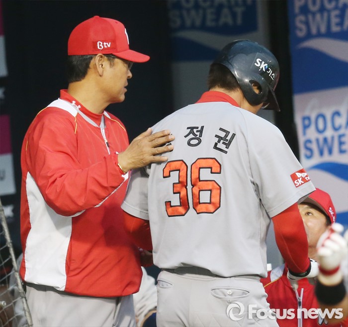 (서울=포커스뉴스) 26일 서울 잠실구장에서 열린 2016 프로야구 SK-두산 경기 2회초 SK 김용희 감독이 선취 득점을 올린 박정권을 환영하고 있다.