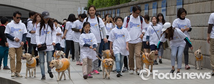 (서울=포커스뉴스) 27일 오전 서울 청계천에서 삼성화재안내견학교 훈련사들과 안내견들이 시민들과 함께 '안내견과의 만남' 행사를 하고 있다.