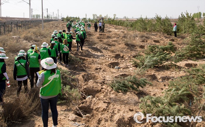 (다라더치/중국=포커스뉴스) 25일 오전 중국 내몽고 다라더치 쿠부치사막에서 2016 미래숲 15기 녹색봉사단원들이 나무 심기 작업을 하고 있다. 미래숲 녹색봉사단은 이번 봉사활동을 통해 황폐화된 사막에 나무 심기 및 각국 청년들과 우호를 증진을 위한 교류 활동을 전개했다.