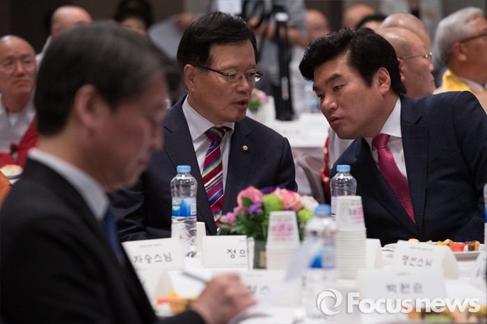 (서울=포커스뉴스) 2일 오후 서울 중구 프레스센터에서 열린 BBS 불교방송 개국 26주년 기념 비전선포식에 참석한 정의화 국회의장(왼쪽)과 원유철 새누리당 원내대표가 대화를 나누고 있다.