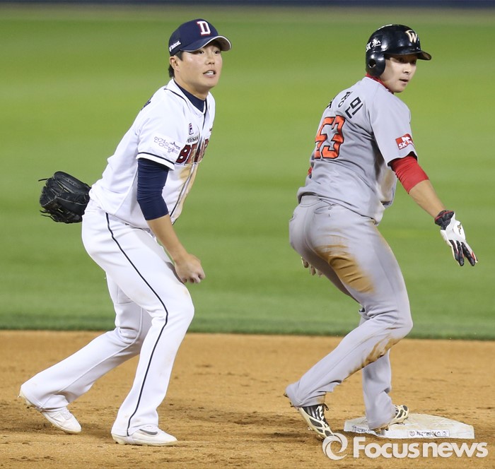 (서울=포커스뉴스) 26일 서울 잠실구장에서 열린 2016 프로야구 SK-두산 경기 8회초 무사 1루에서 두산 2루수 류지혁이 SK 1루주자 최정민을 포스아웃시키고 1루를 바라보고 있다.