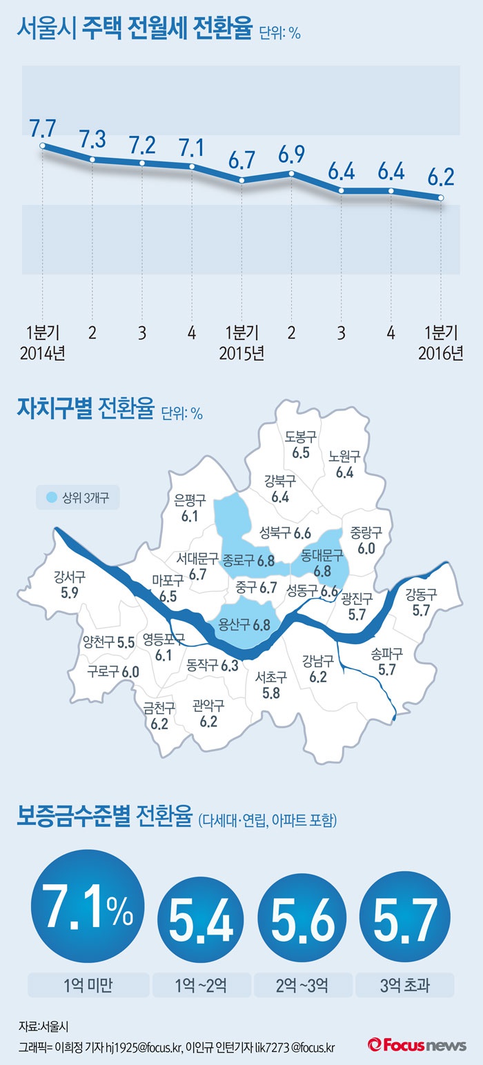 (서울=포커스뉴스) 올해 1분기 서울시내 주택 전월세전환율은 작년말 보다 소폭 하락한 6.2%를 기록했다. 자치구별로는 종로구, 용산구, 동대문구가 높았다.