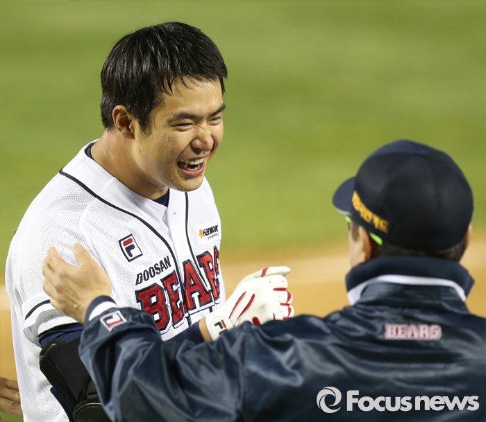 (서울=포커스뉴스) 28일 서울 잠실구장에서 열린 2016 프로야구 SK-두산 경기 9회말 1사 1,2루에서 역전 끝내기 우월 3점홈런을 날린 두산 김재환이 김태형 감독의 축하를 받고 있다.