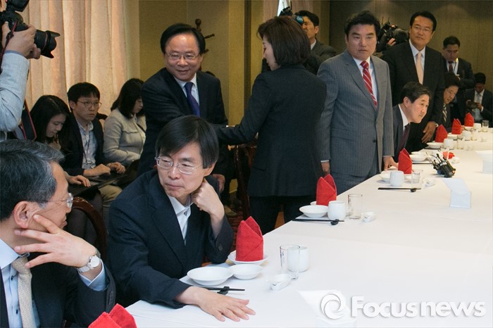 (서울=포커스뉴스) 25일 오후 서울 여의도의 한 중식당에서 새누리당 중진의원 오찬 간담회에 참석한 정희수(왼쪽), 조경태(왼쪽 두번째) 의원이 심각한 표정을 하고 있다.