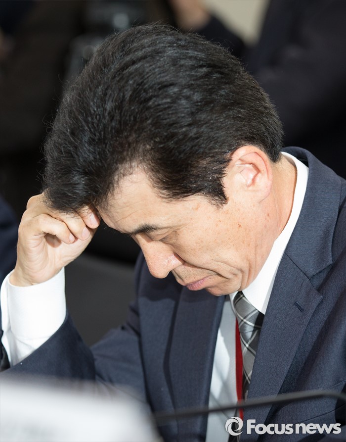 (세종=포커스뉴스) 정세화 한진해운신항만 사장이 25일 오후 세종시 정부세종청사 해양수산부 중회의실에서 열린 해운시장 및 해운동맹 재편 관련 대책회의에 참석해 잠시 얼굴을 만지며 생각에 잠긴 모습을 보이고 있다.