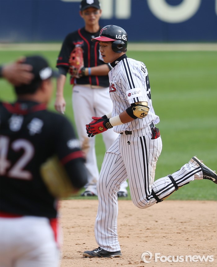 (서울=포커스뉴스) 1일 서울 잠실구장에서 열린 2016 프로야구 kt-LG 경기 5회말 LG 선두타자 채은성이 좌월 1점 홈런을 치고 베이스를 돌고 있다.