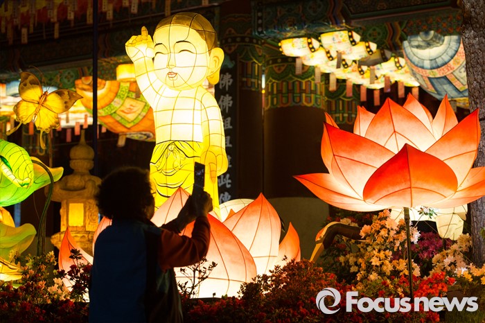 (서울=포커스뉴스) 부처님오신날을 앞두고 26일 밤 서울 종로구 견지동 조계사 정문 앞에 다양한 형태의 연등들이 불을 밝히고 있는 가운데 길을 지나던 시민들이 연등 앞에서 기념사진을 찍고 있다.