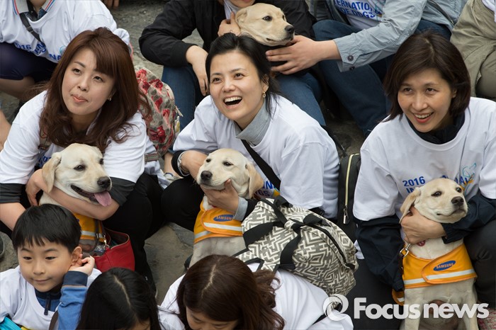 (서울=포커스뉴스) 27일 오전 서울 청계천에서 삼성화재안내견학교 훈련사들과 안내견들이 시민들과 함께 '안내견과의 만남' 행사를 하고 있다.