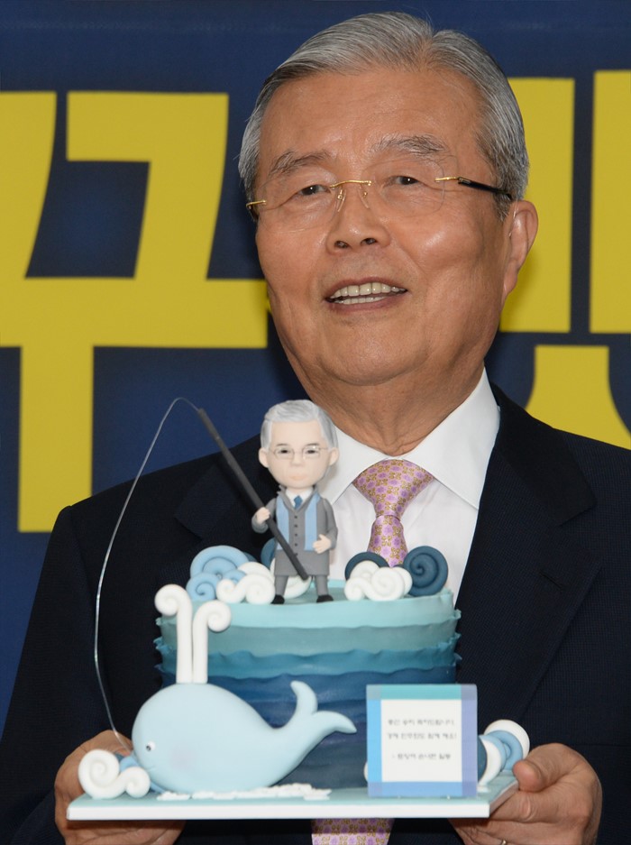(서울=포커스뉴스) 김종인 더불어민주당 비대위 대표가 26일 오후 서울 여의도 국회에서 김 대표의 팬클럽 '트잉여 손녀팬' 소속 회원들에게 선물받은 케이크를 들고 포즈를 취하고 있다. <사진제공=더불어민주당>