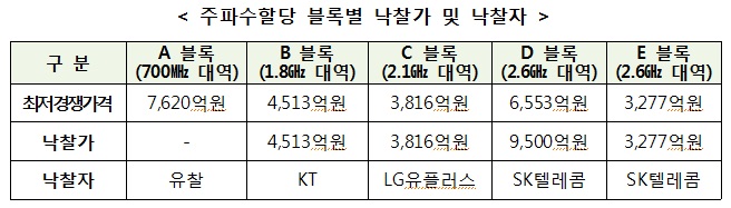 전성배 미래부 전파정책국장은 “이번에 공급된 주파수를 통해 세계최고 수준의 우리나라 모바일 환경이 조성되어 국민편익이 증대되고 정보통신기술(ICT) 관련 투자가 활성화될 것”이라고 하면서 “올해 하반기에는 이동통신 뿐 만 아니라 공공, 신산업 등 다른 영역까지 포괄하는 중장기 주파수 공급계획(K-ICT 스펙트럼 플랜)을 수립해 모바일 트래픽 급증과 5G시대 도래에 대비하기 위한주파수가 적기에 공급될 수 있도록 최선의 노력을 기울여 나갈 것”이라고 말했다.주파수할당 블록별 낙찰가와 낙찰자.<표제공=미래부>