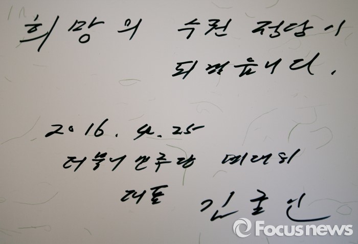 (광주=포커스뉴스) 김종인 더불어민주당 비대위 대표가 25일 오전 광주 북구 국립 5·18민주묘지를 방문해 20대 총선 당선인 및 광주·전남지역 낙선 인사들과 참배했다. 사진은 김 대표가 남긴 방명록.