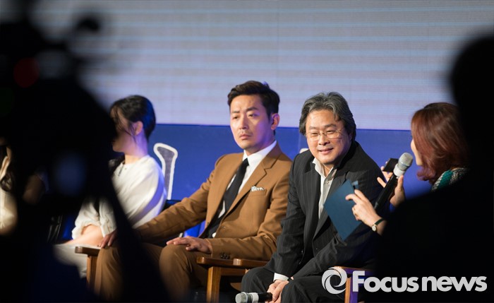(서울=포커스뉴스) 2일 오전 서울 중구 웨스틴조선호텔에서 열린 영화 '아가씨' 제작보고회에 참석한 영화감독 박찬욱(오른쪽 두번째)가 진행자에게 질문을 받고 있다.