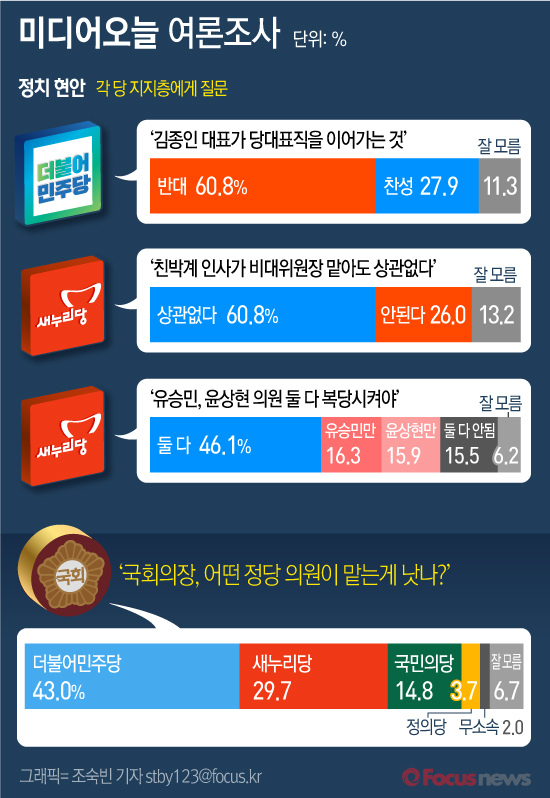 이번 여론조사에 따르면 더민주 지지층 중 김종인 비상대책위원장이 계속 대표를 맡는 것에 찬성한다는 응답은 27.9%에 그쳤다. 반면 김종인 대표가 당 대표를 맡는 것에 반대하는 더민주 지지층은 60.8%로 과반 이상이었다.