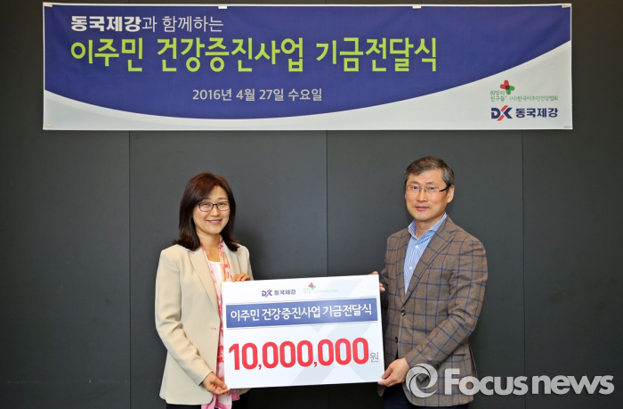 (서울=포커스뉴스) 동국제강은 이주민·다문화 가정 건강증진사업을 후원하고자 27일 오전 을지로 페럼타워 2층 회의실에서 '한국이주민건강협회 희망의친구들'에게 기금 1000만원을 전달했다고 밝혔다.
