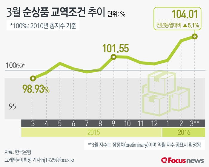25일 한국은행이 발표한 ‘3월 무역지수 및 교역조건’을 보면 지난달 순상품교역조건지수는 104.01로 전년 동월 대비 5.1% 상승했다. 순상품교역조건지수는 전년 동기 대비 기준으로 지난 2014년 9월(90.31)부터 19개월째 오름세를 보였다.