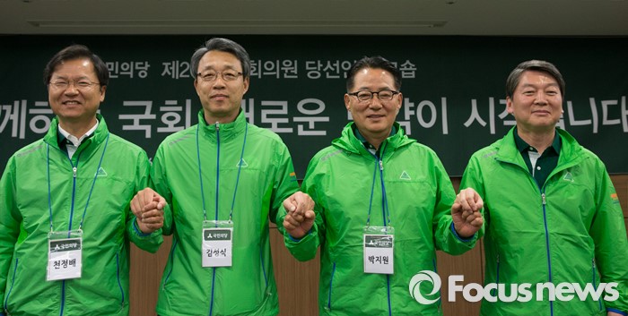 (양평=포커스뉴스) 안철수 국민의당 상임공동대표와 천정배 공동대표가 27일 오전 경기도 양평 한화리조트에서 열린 당선자 워크숍에서 박지원 신임 국민의당 원내대표, 김성식 신임 정책위의장과 함께 기념촬영을 하고 있다. 왼쪽부터 천정배 대표, 김성식 정책위의장, 박지원 원내대표, 안철수 대표.