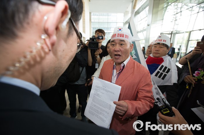 (서울=포커스뉴스) 26일 오후 서울 영등포구 전경련회관 앞에서 열린 어버이연합 억대 금품지원 규탄 기자회견이 끝나고 애국국민운동대연합 오천도 대표와 회원들이 상근부회장의 면담을 요청하고 있다.