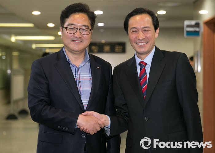 (서울=포커스뉴스) 원내대표 경선에 출마하는 우상호(오른쪽), 우원식 더불어민주당 의원이 29일 오후 서울 여의도 국회 정론관 앞에서 만나 취재진을 향해 포즈를 취하고 있다.