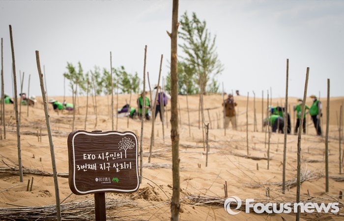 (다라더치/중국=포커스뉴스) 25일 오후 중국 내몽고 다라더치 쿠부치사막에 엑소 시우민의 팬들이 기증한 나무들이 심겨 있다. 시우민 팬클럽은 2014년부터 매 해마다 미래숲에 나무를 기증하고 있다.
